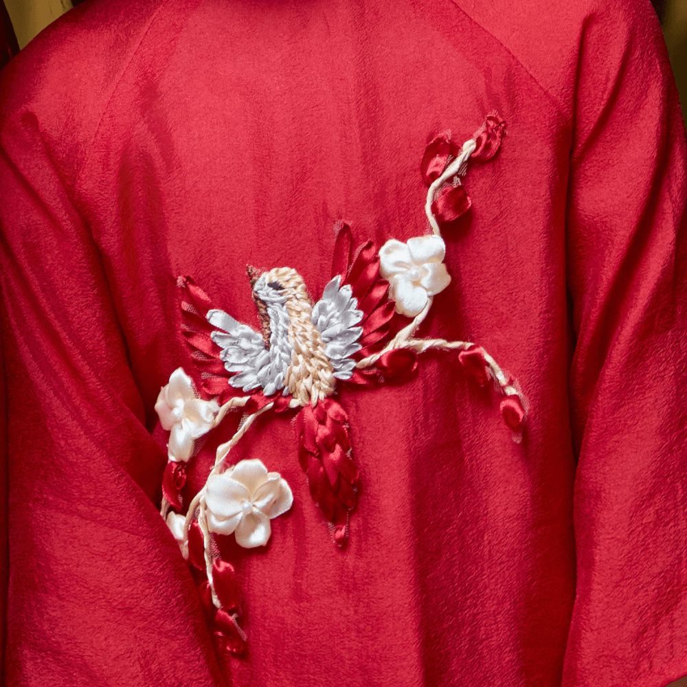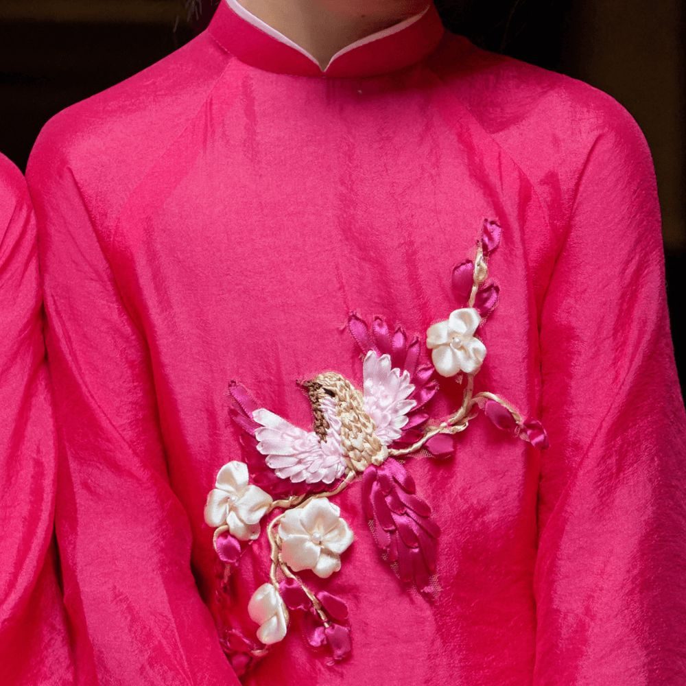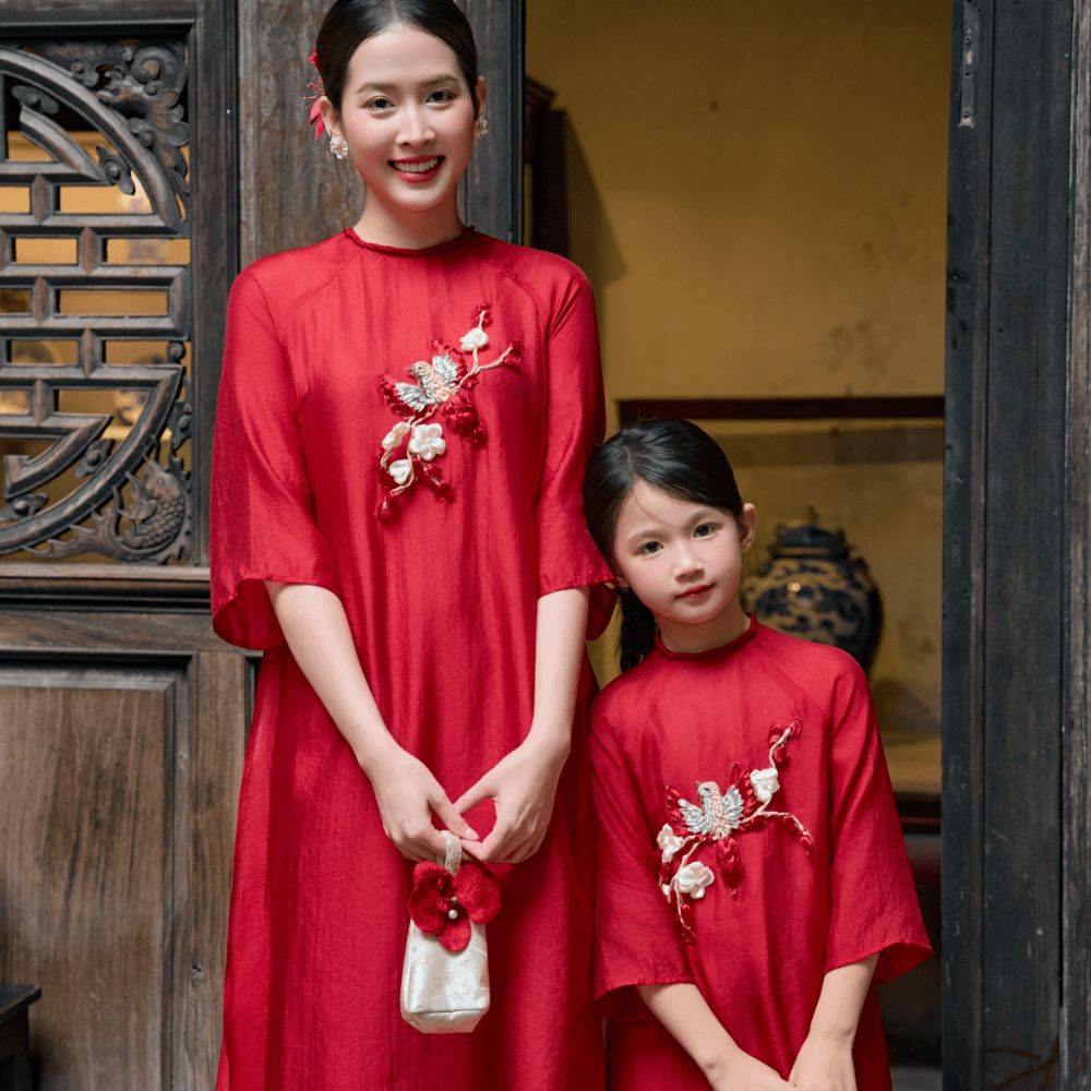 Áo Dài Bé Xuân Nghi nổi bật với phom dáng mềm mại và họa tiết thêu tay đáng yêu.