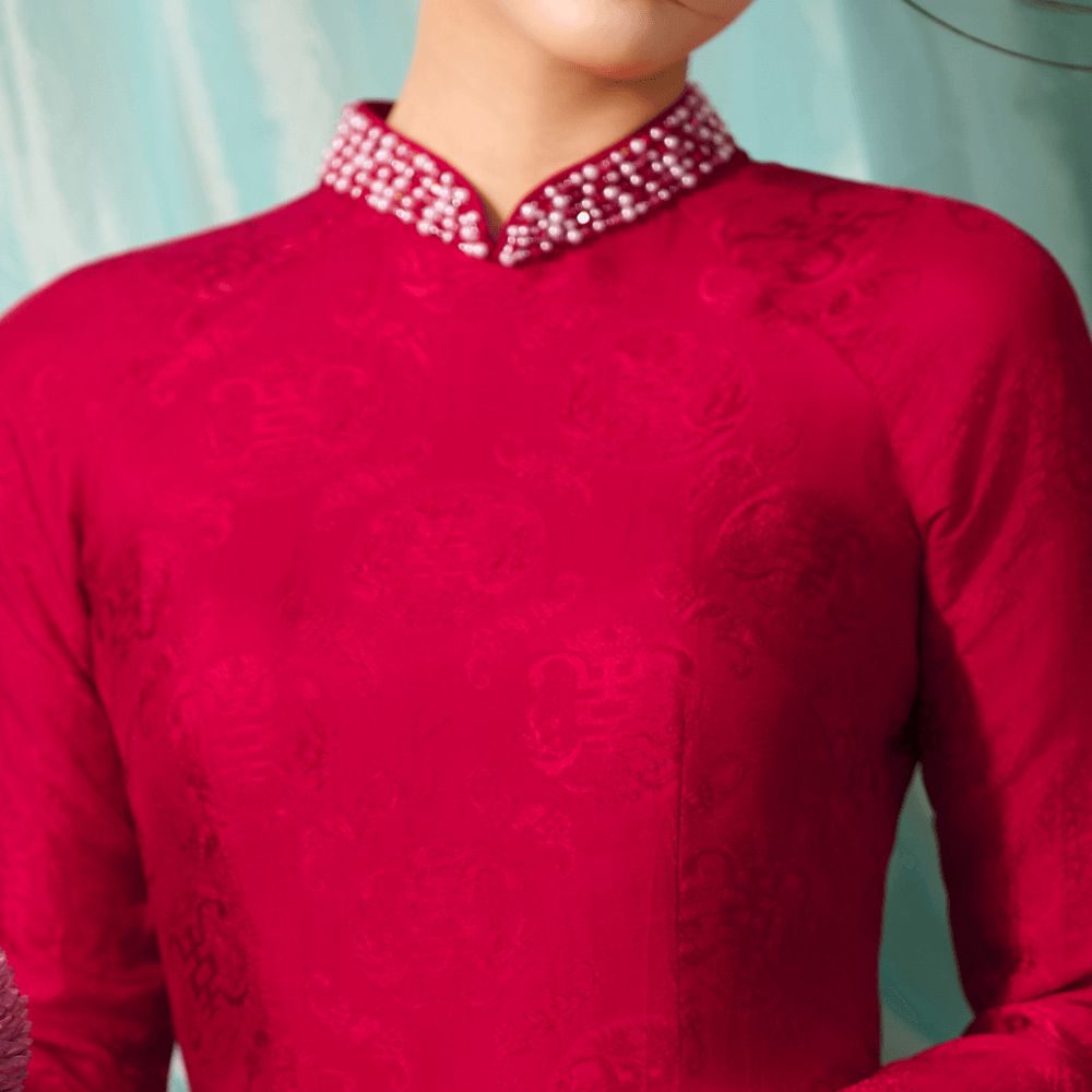 Mẫu áo dài Cẩm Đường nổi bật với gam đỏ quyền lực cùng chi tiết tay dài truyền thống.