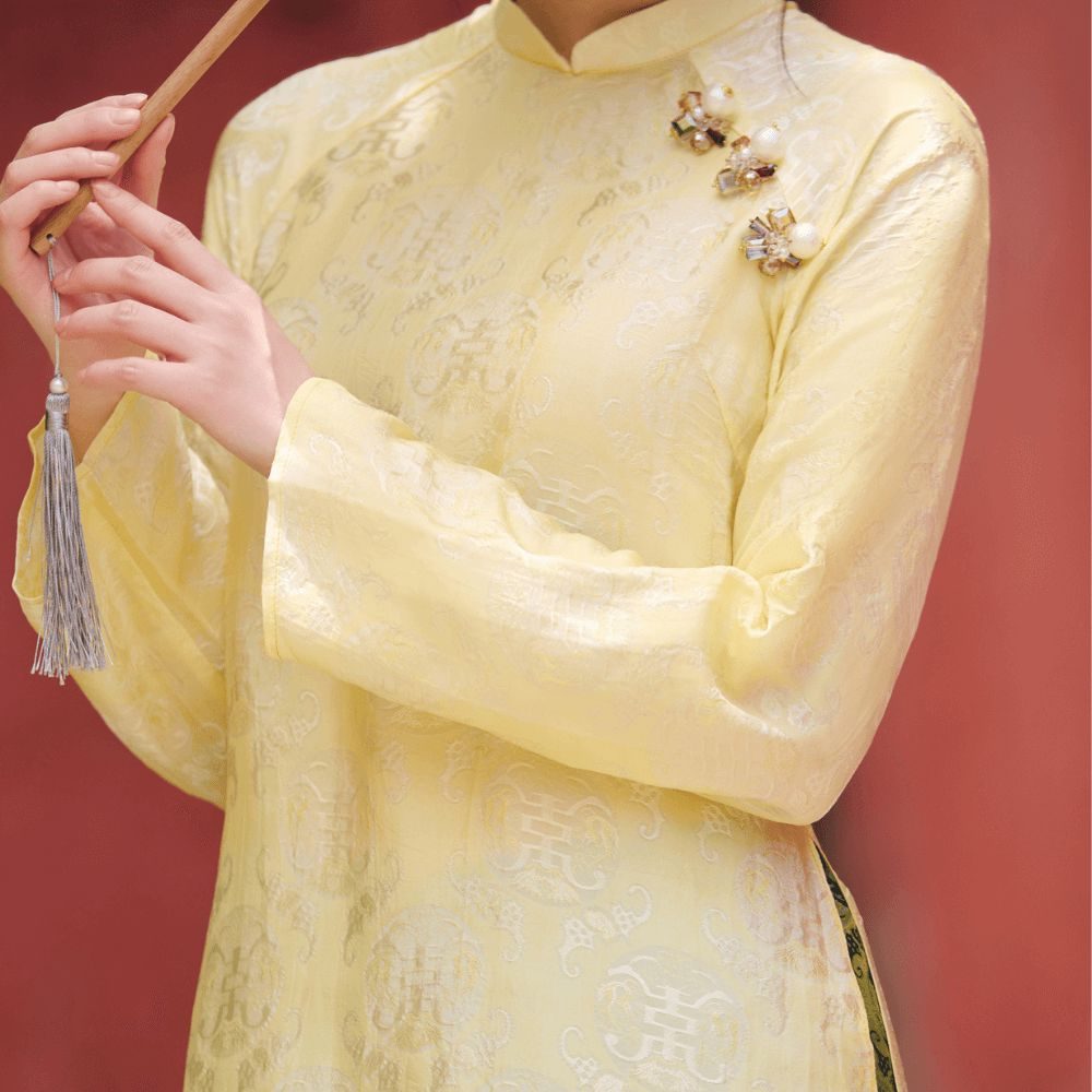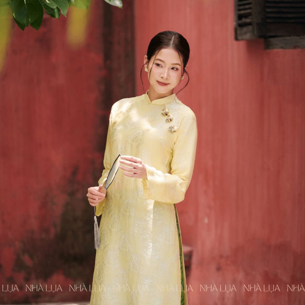 Điểm nhấn của áo dài Hoàng Yên nằm ở gam vàng mơ rực rỡ nhưng vẫn giữ được sự nhẹ nhàng và tinh tế. Họa tiết thêu tay mô phỏng cánh hoa mềm mại chạy dọc thân áo, tạo nên tổng thể thanh thoát và sang trọng. Phom dáng ôm nhẹ, tà dài thướt tha giúp tôn lên sự duyên dáng và đường nét mềm mại của người mặc.
