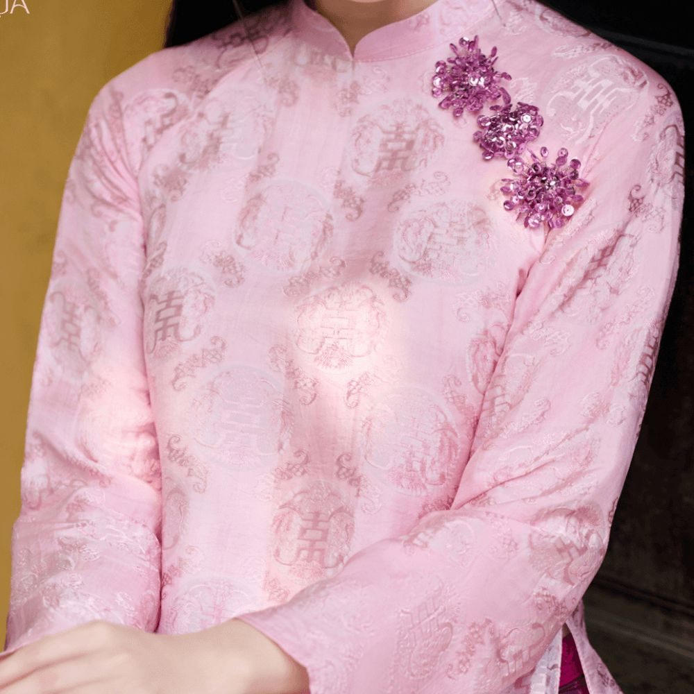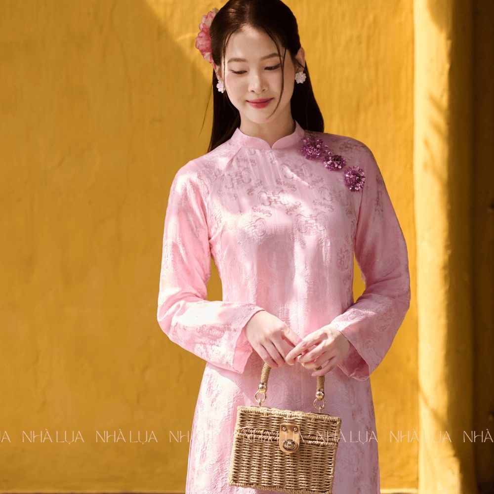 Áo Dài Hồng Liên nổi bật với phom dáng thướt tha và họa tiết thêu tay mềm mại.