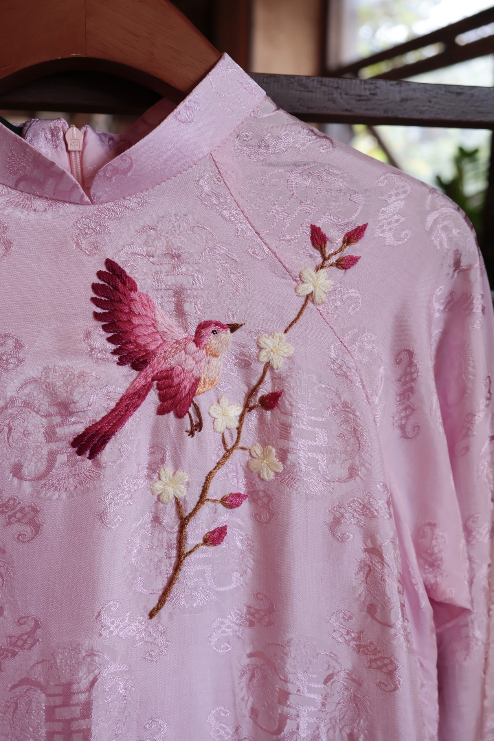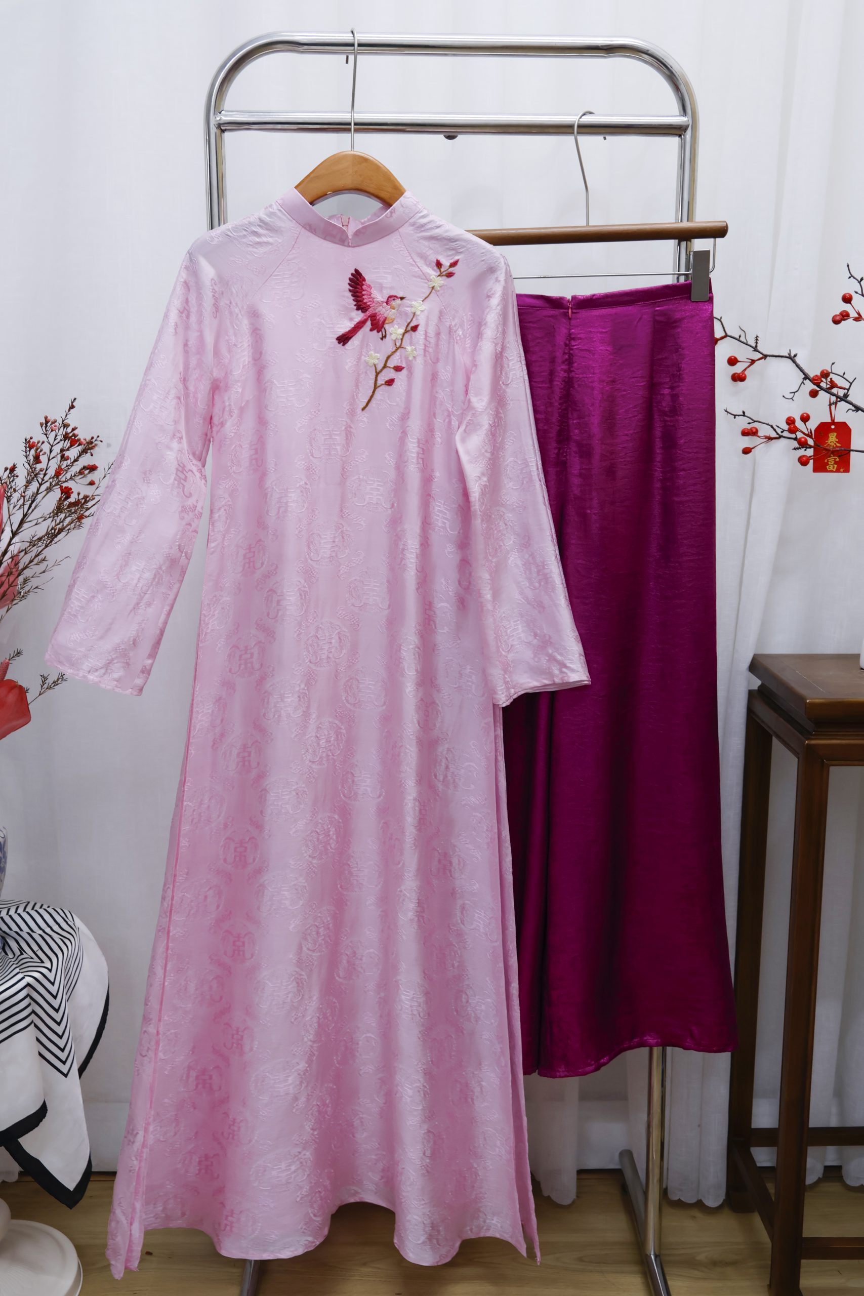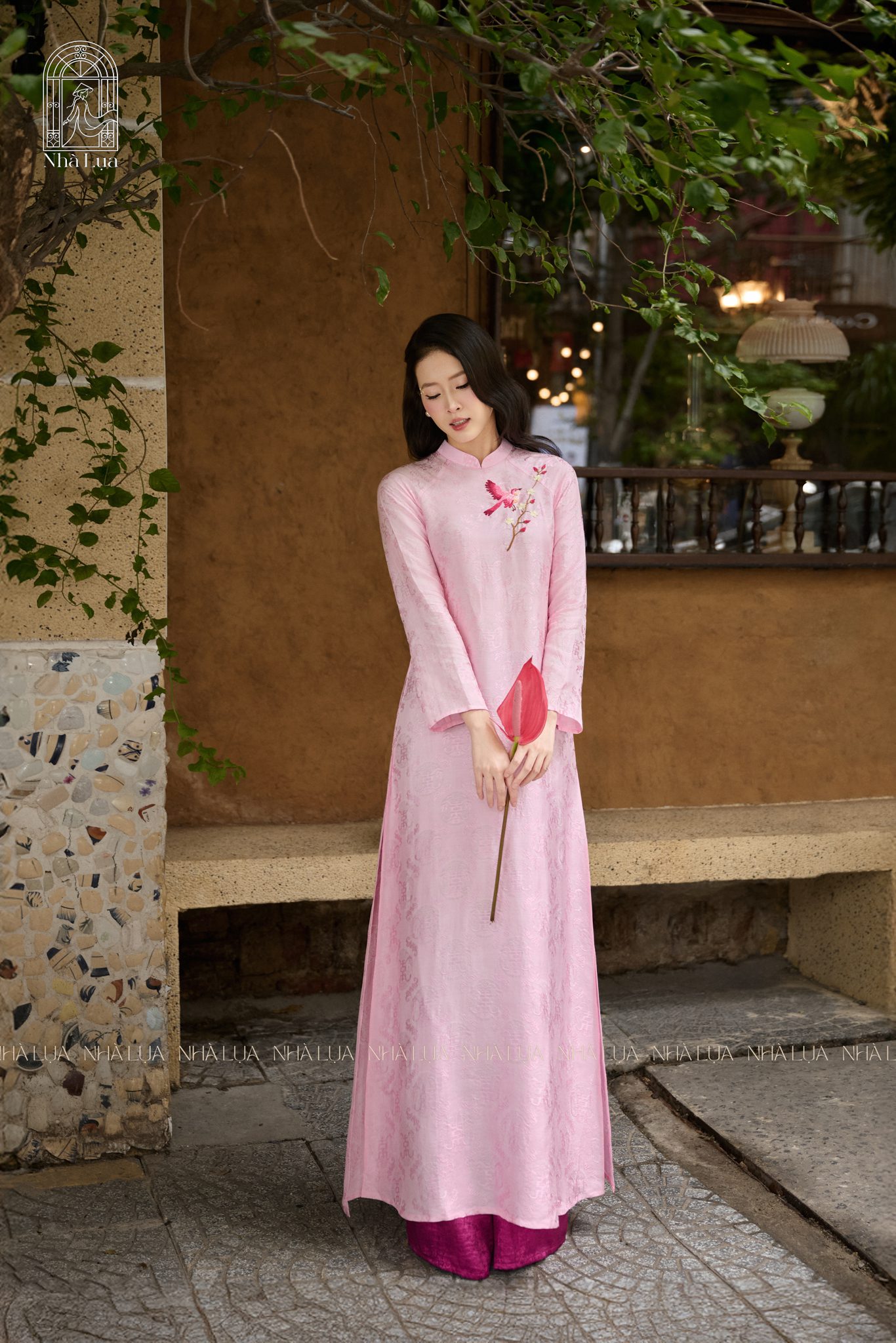 Áo Dài Hồng Liên Thêu Tay Màu Hồng Sen