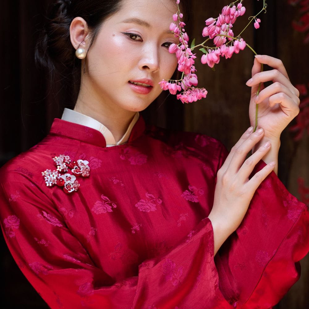 Chi tiết thủ công: Điểm nhấn khuy tết kết hoa đá thủ công tinh xảo, tạo nên vẻ quý phái và nét nữ tính đặc quyện cho trang phục.