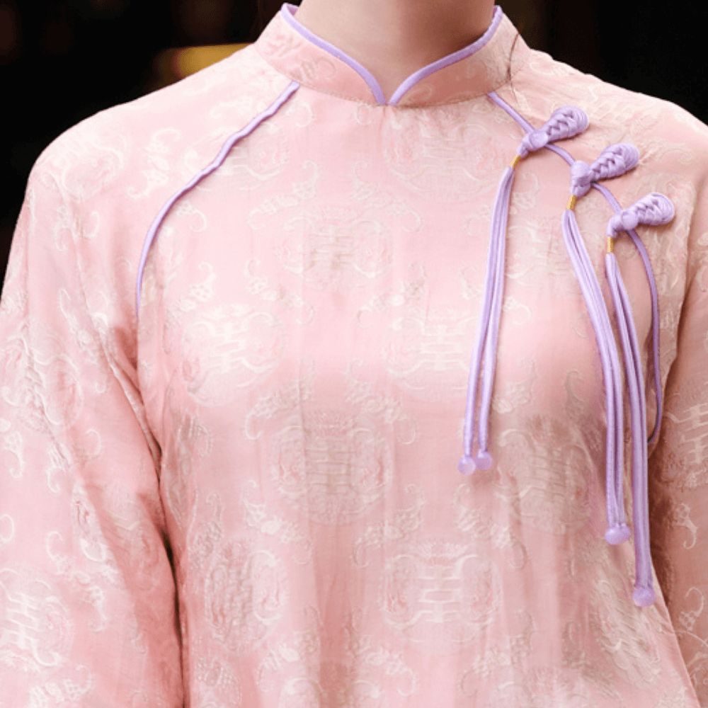 Áo Dài Khuê Vân mang vẻ đẹp như những áng mây hồng trôi nhẹ trên nền trời, tạo cảm giác mềm mại và thanh thuần. Thiết kế cổ trụ bo viền tím kết hợp khuy cài dây rủ tạo điểm nhấn duyên dáng, tôn lên sự nữ tính và tinh tế của người mặc.