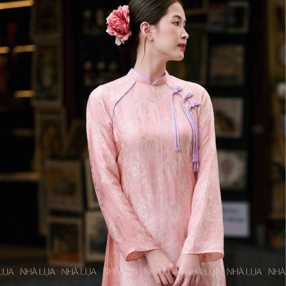 Mẫu Áo Dài Khuê Vân nổi bật với sắc hồng phấn nhẹ nhàng, họa tiết gấm nổi sang trọng.