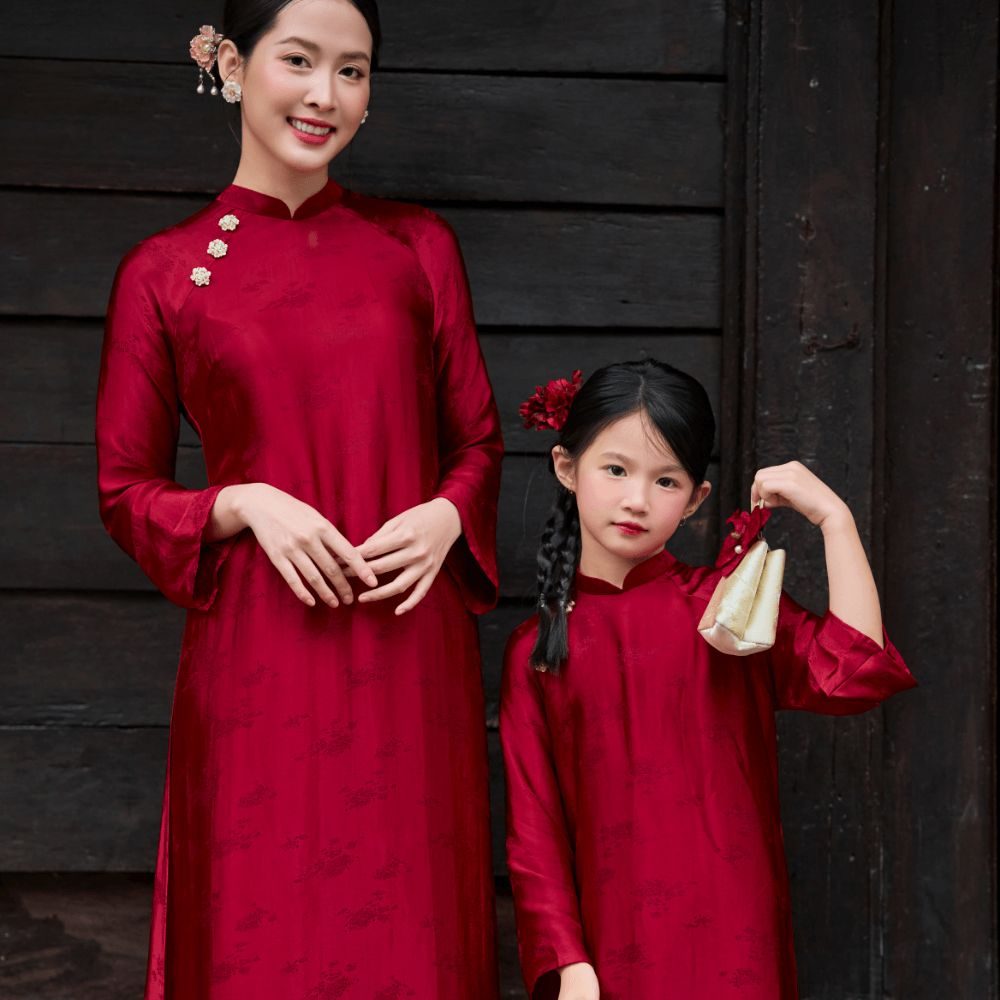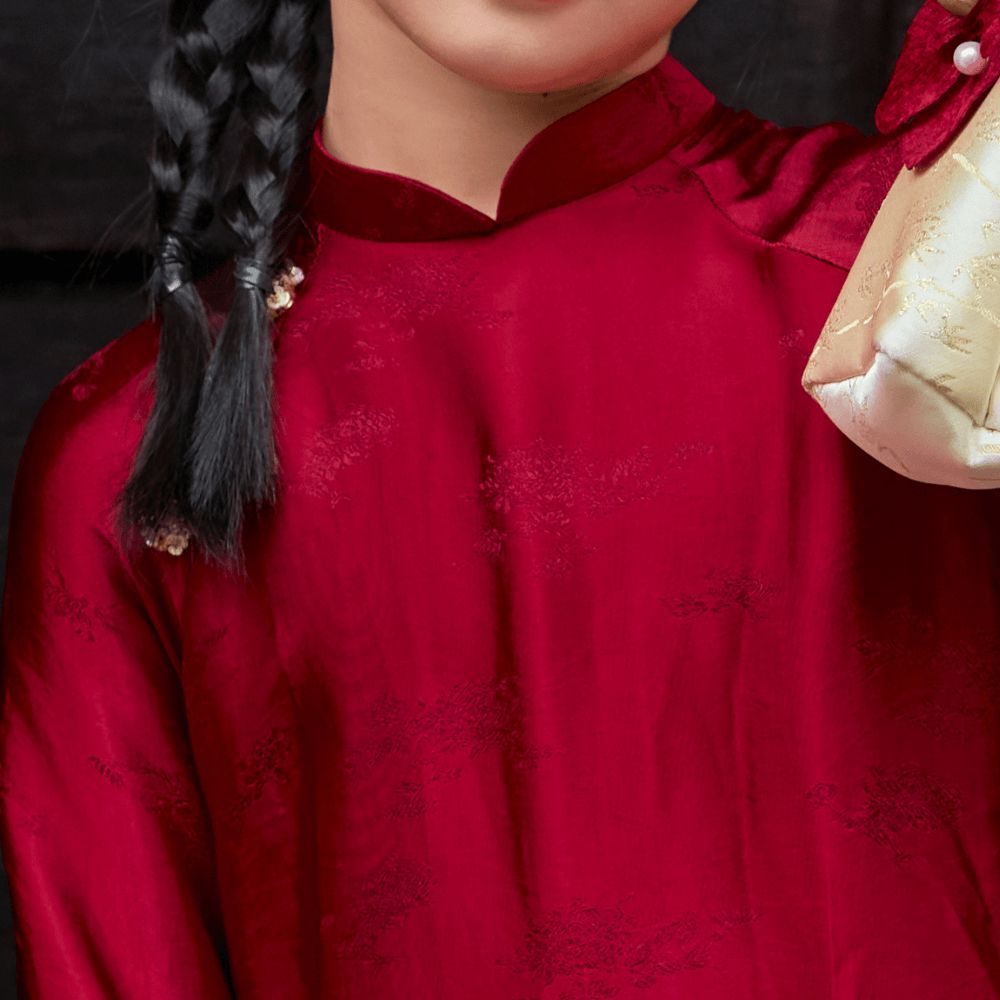 Áo Dài Nguyệt Sa nổi bật với phần cổ tròn cách điệu và họa tiết thêu tinh xảo.