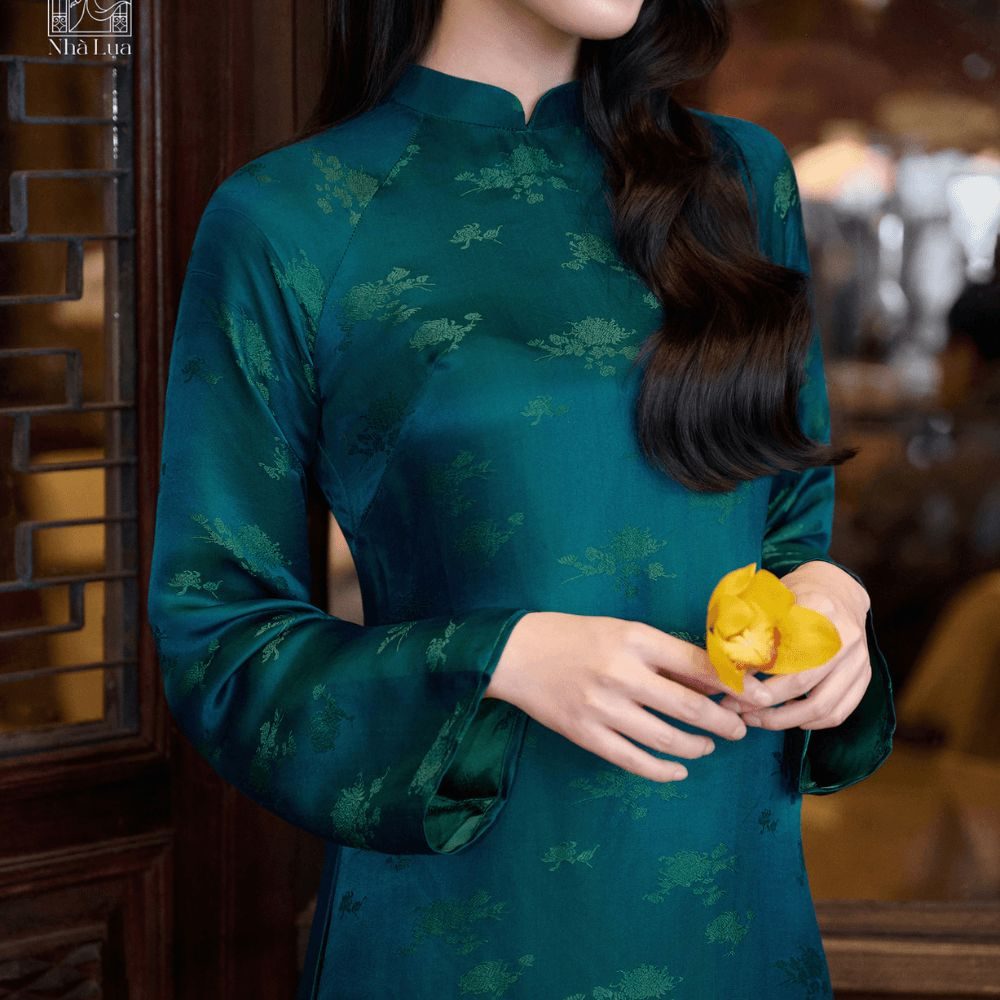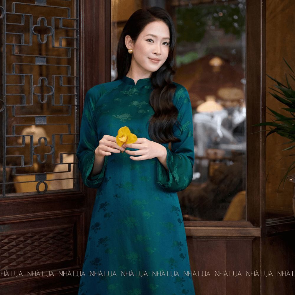 Mẫu Phương Lam nổi bật với cổ tròn duyên dáng, được thêu tay tinh xảo trên nền lụa tơ tằm.