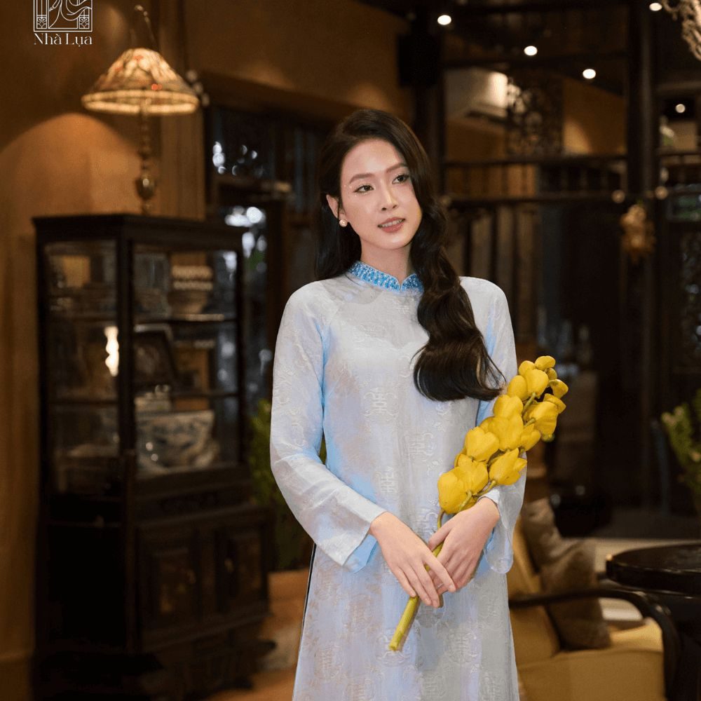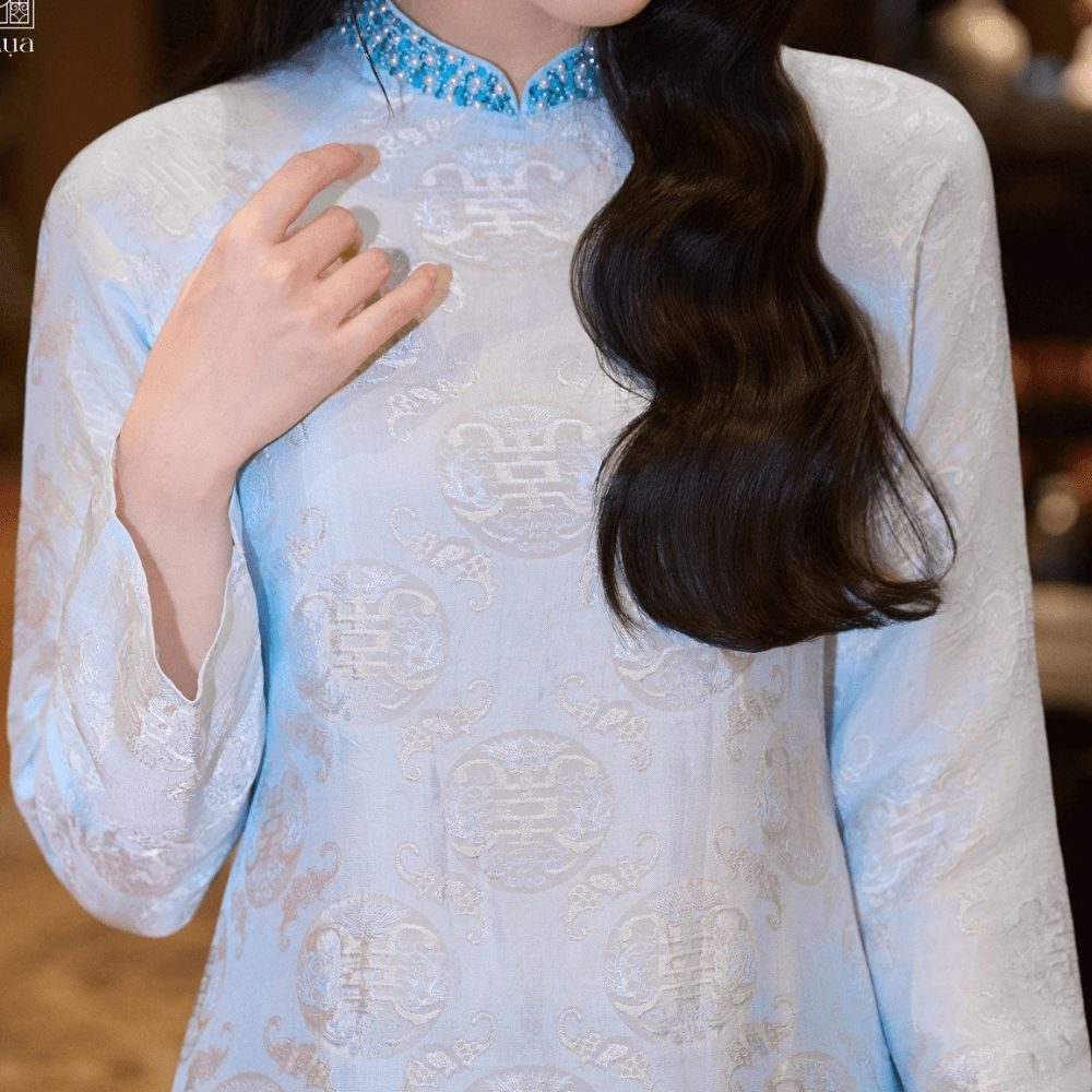 Mẫu Áo Dài Thanh Khuê Đính Cườm gây ấn tượng với phần cườm đính thủ công nổi bật.